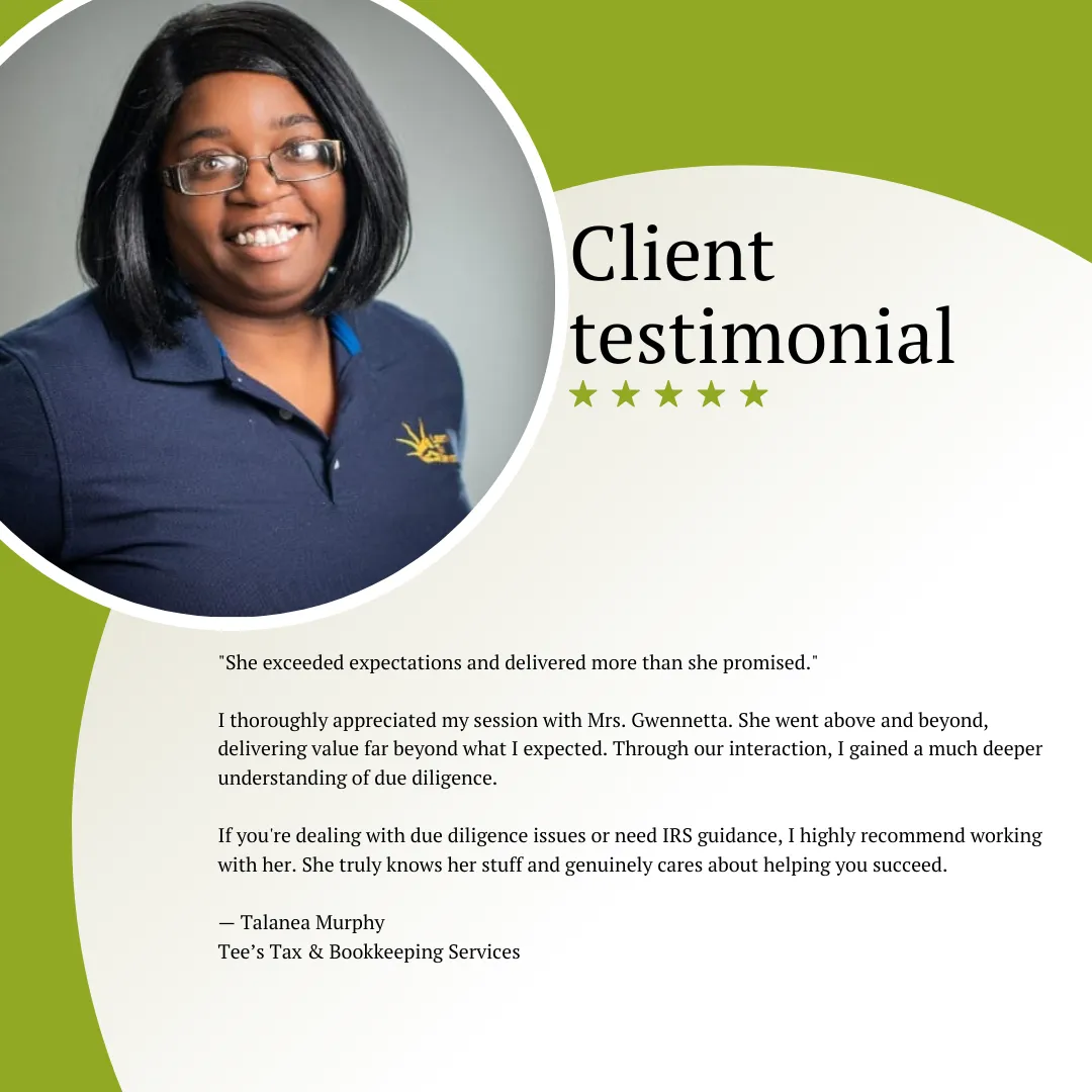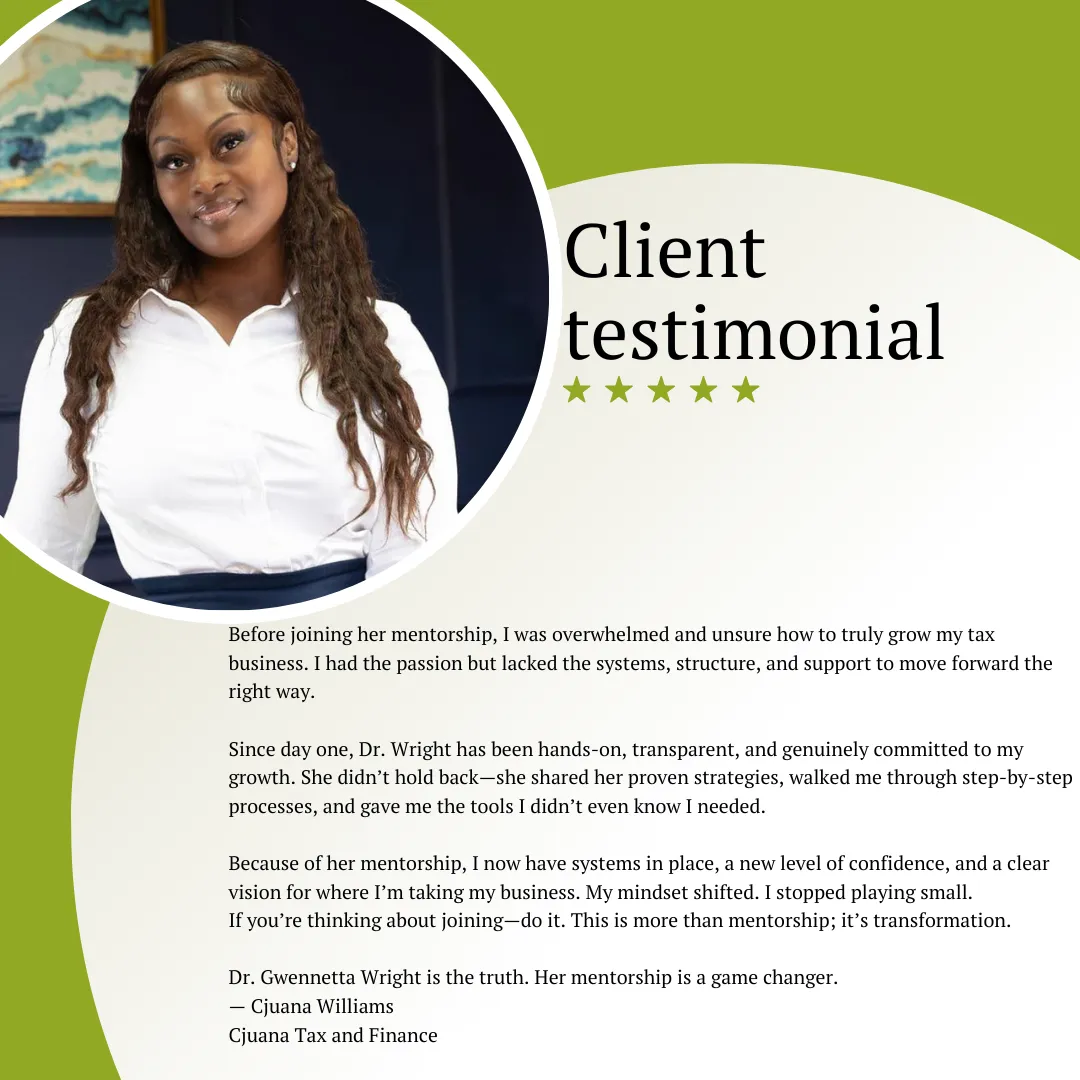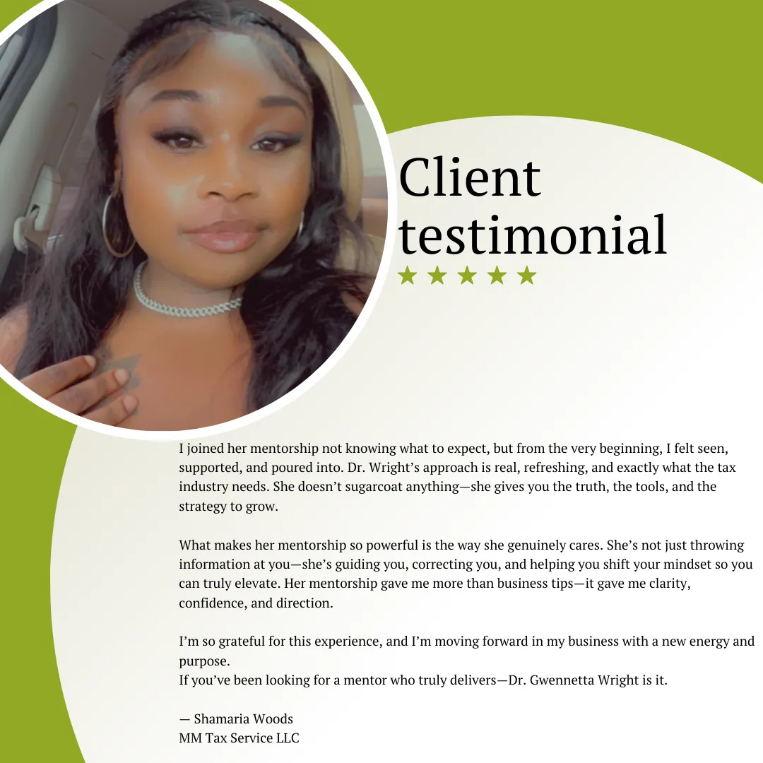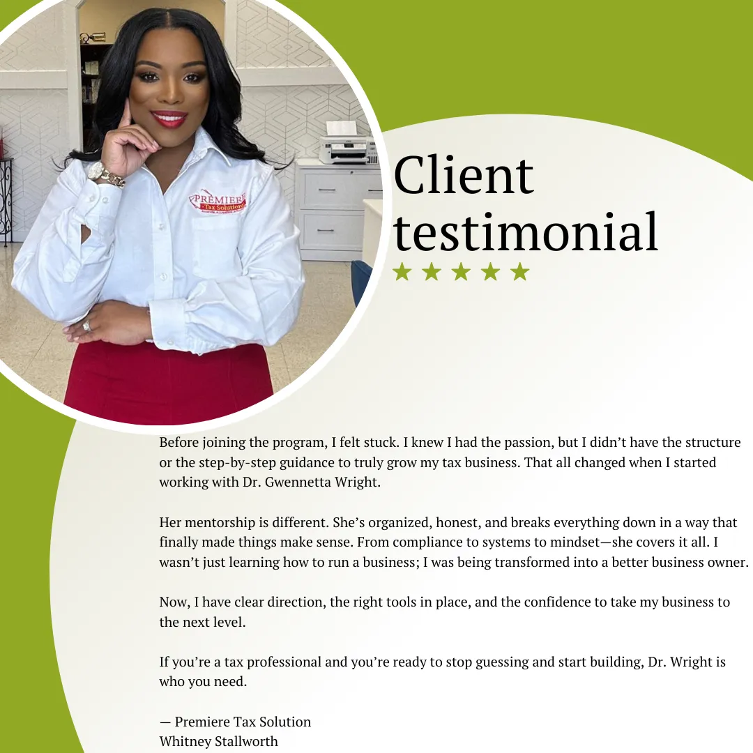 With over 21 years in the tax industry, Gwennetta Wright is a trusted business strategist, tax expert, and educator. She founded Xpert Tax Academy after seeing too many preparers get stuck — either overwhelmed by technical details, unsure about compliance, or unable to scale their businesses.